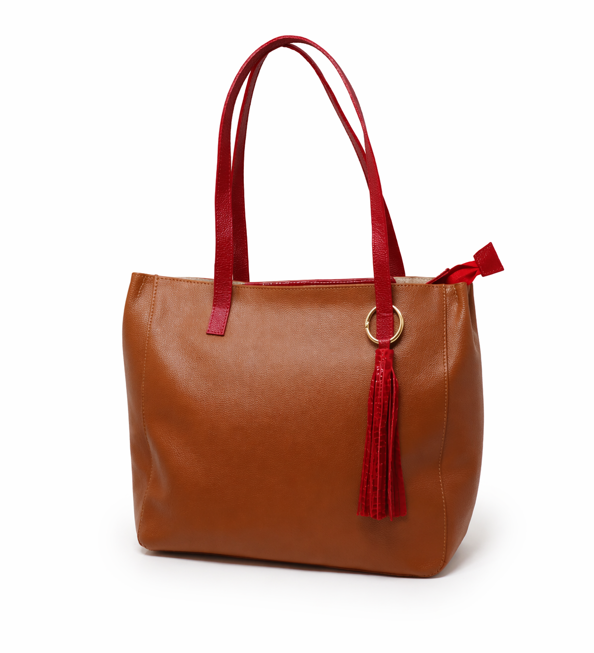 Ref. 24223 Bolso Dama en Cuero Plano Color Miel – Manija Doble Plana Color Rojo – Fleco Rojo
