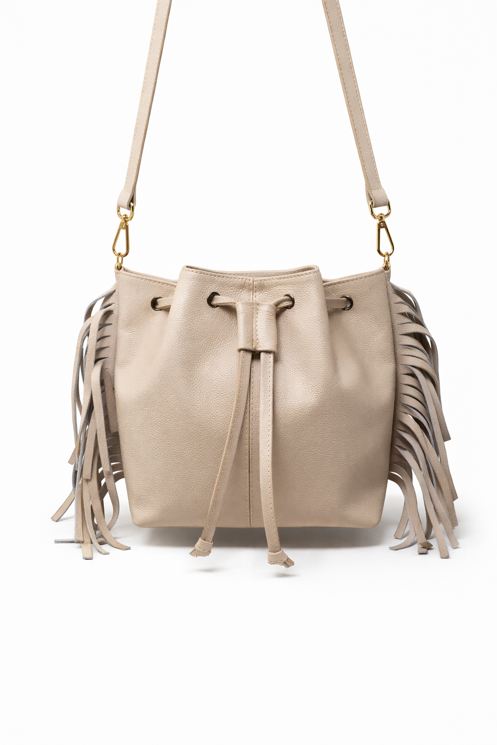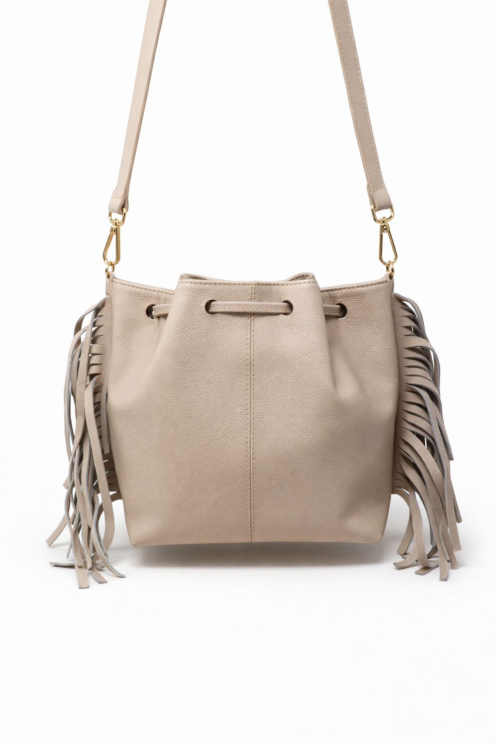 Ref. 26122 Bolso Manos Libres Tipo Bombonera de Dama en Cuero Plano Color Taupe claro – Flecos Laterales