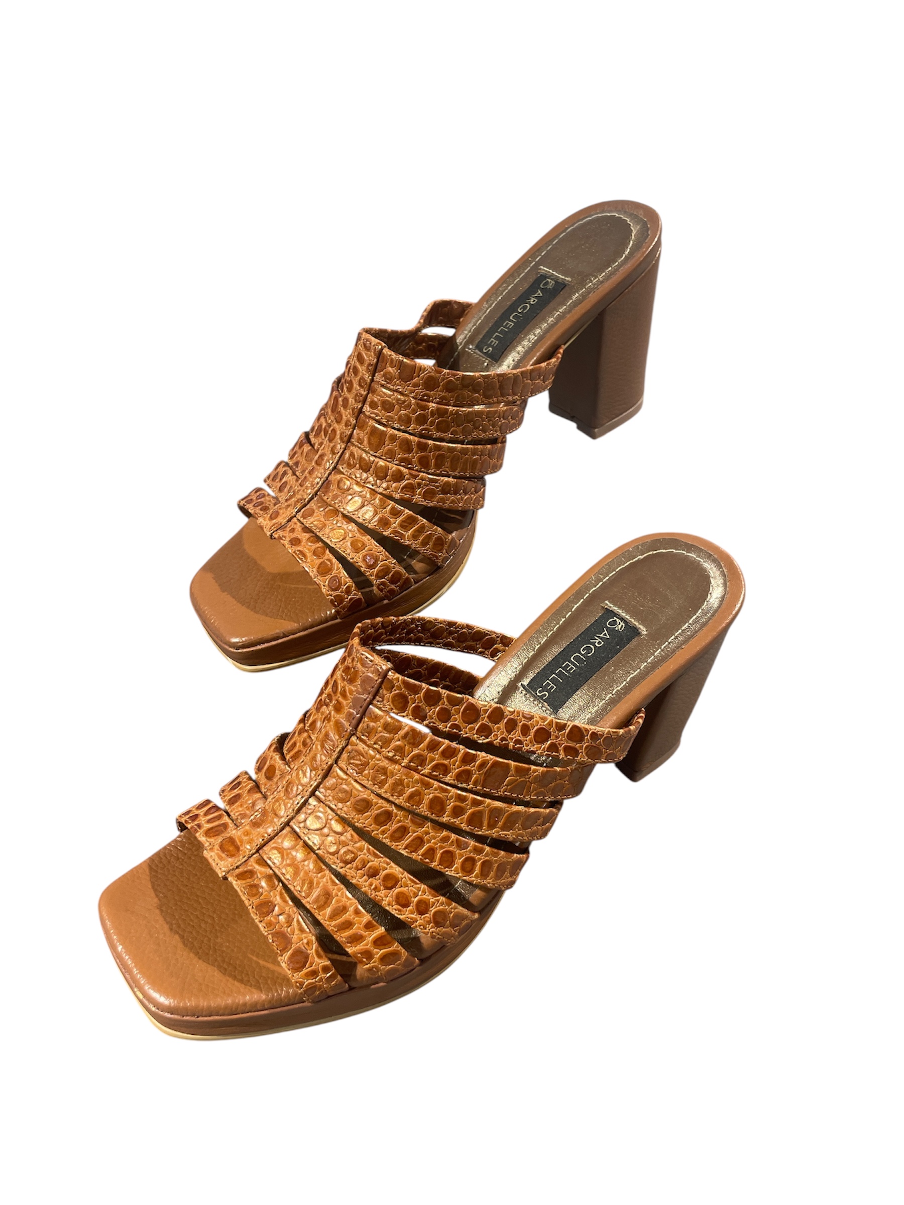 CALZADO EN CUERO 100%: REF. 2305-5 TACÓN DESTALONADO EN CUERO GRABADO TALYPE COLOR MIEL, TACON EN ALTURA DE 5,5 CMS.